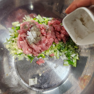 5. 다짐육, 다진 대파, 마늘, 소금 1 티스푼, 후추 1 티스푼을 넣고 섞어주시다가 튀김가루 2숟가락 넣어주시면 됩니다. 만약에 반죽이 너무 "질다=끈적" 진득거린다면 조금 더 치데주면서 반죽을 해주면 된다. 이렇게 했는데 안돼면 튀김가루를 조금추가해서 뭉쳐주면 됩니다.
