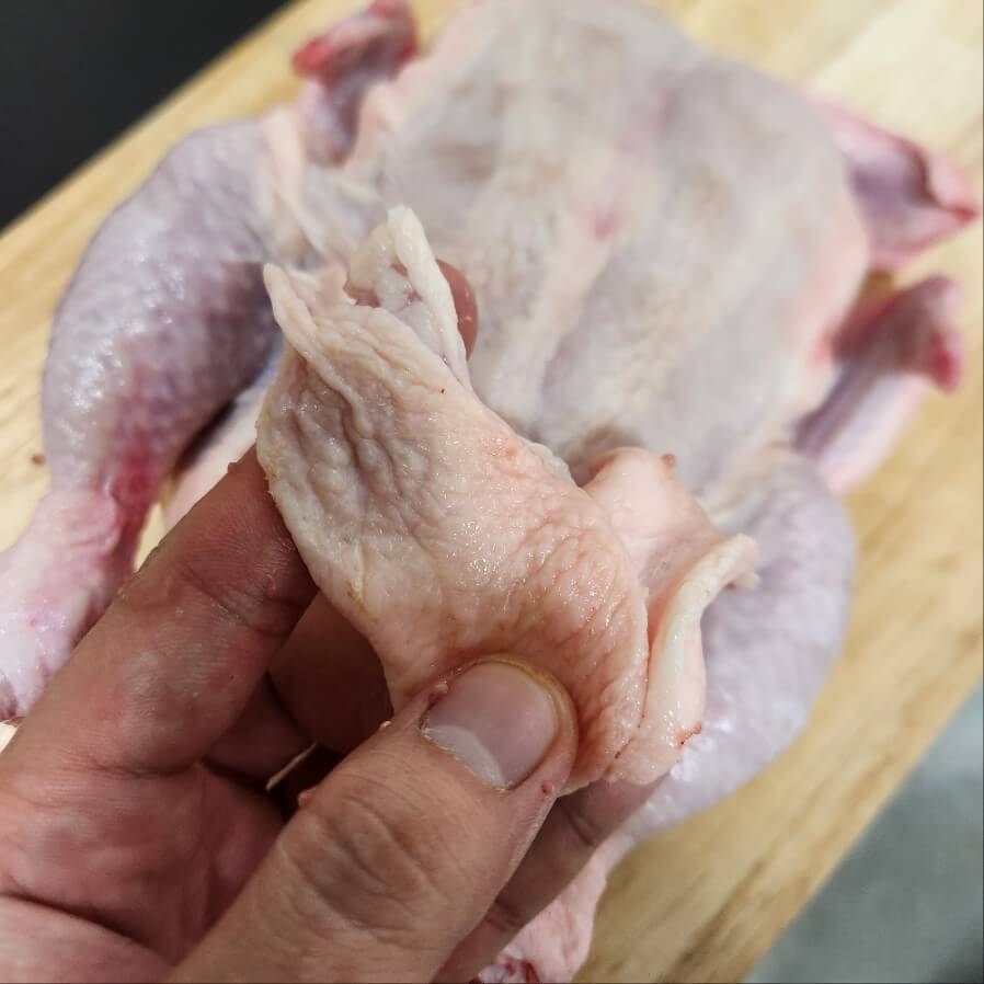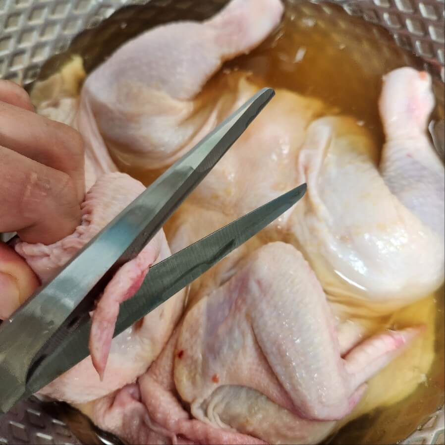 ✅닭의 꽁지 주변을 모두 잘라주면 된다. 닭 꽁지 와 주변 지방을 모두 가위로 자르고, 생닭은 가위로 반으로 잘라주면 된다.