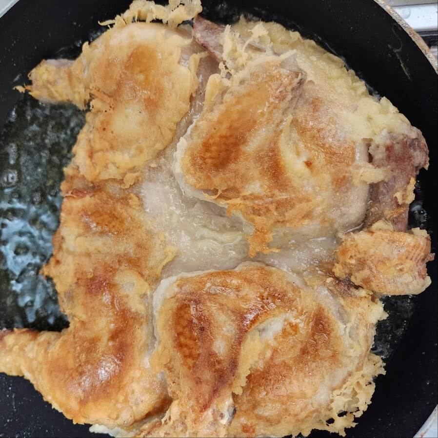 3. 튀김 반죽을 범벅시킨 닭은 이제 튀겨줄 차례이다.