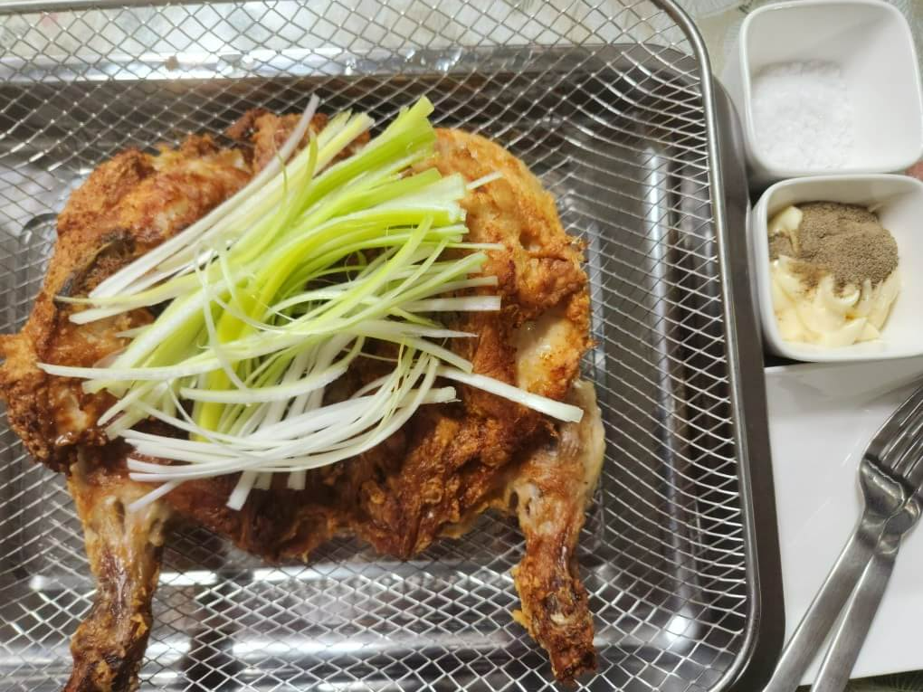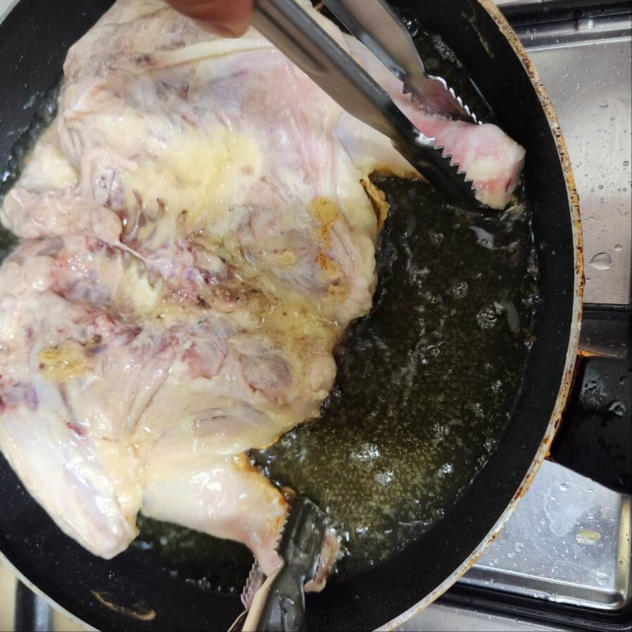 ✅ 닭은 뒤집어서 튀길 때는 집개로 양 발을 잡고 뒤집어주면 되며, 두꺼운 부분은 칼로 다리, 가슴살 등을 마구 찔러주면 된다.