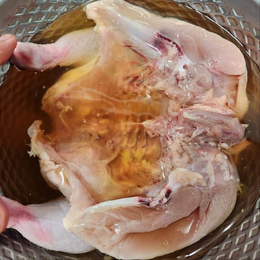 2. 반으로 자른 생닭을 흐르는 물에 씻어서 생닭의 이물질을 제거하고, 맥주로 담가서 핏물 제거와 연육작용, 잡내를 제거해 주면 된다.