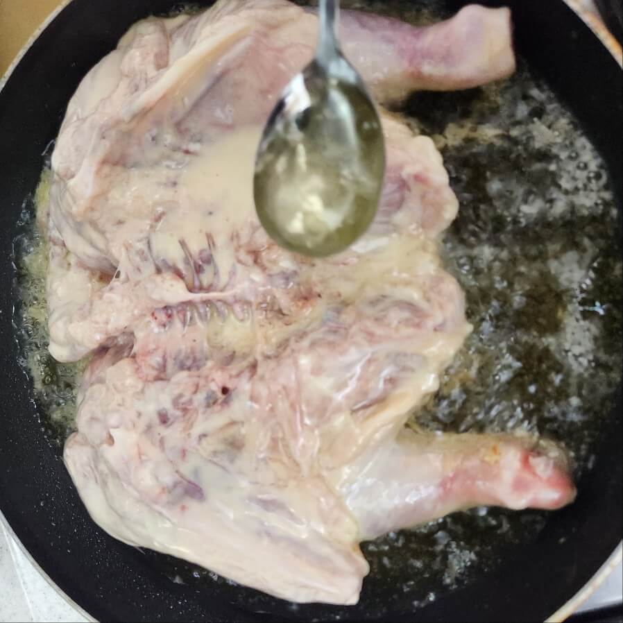 ✅프라이팬으로 닭을 튀길 때 기름을 숟가락으로 닭에 부어주면서 튀겨주면 된다.