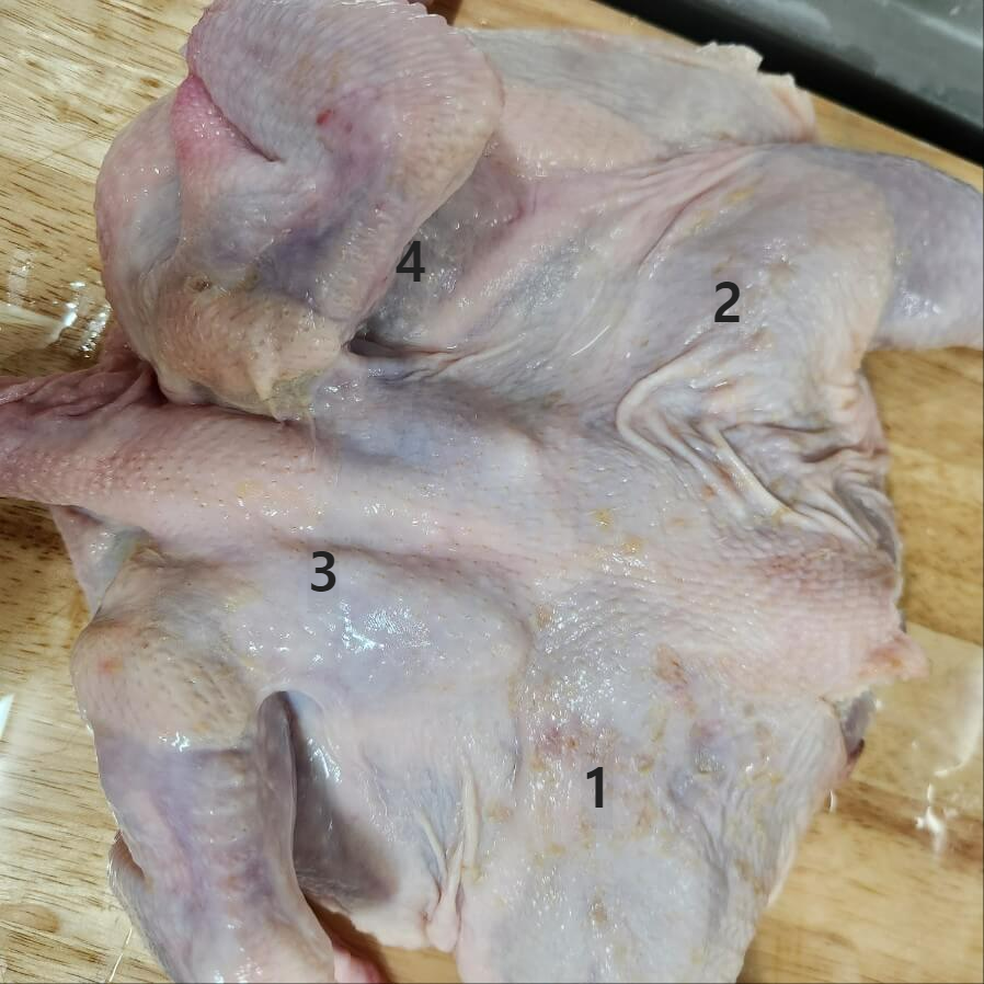 ✅두 번째 사진처럼 닭의 관절을 눌러서 닭을 펴주면 된다. 1번부터 4번까지 따라서 눌러주면 된다.