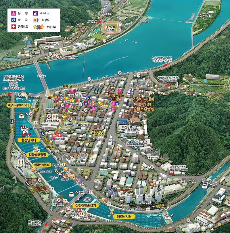 위 사진은 화천 산천어 축제 전체 지도 입니다. 세계 4대 겨울 축제라고 불리는 만큼 얼음의 나라 화천 산천어 축제 규모도 엄청 큽니다.