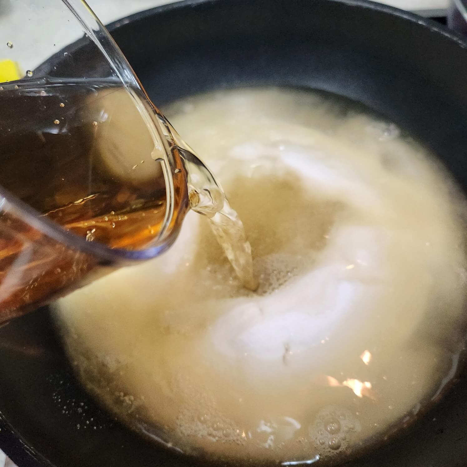 3. 물이 끓을 때 중간불로 바꿔주시고 레몬즙을 넣고 설탕, 소금이 녹을 때 까지 계속 저어주세요.