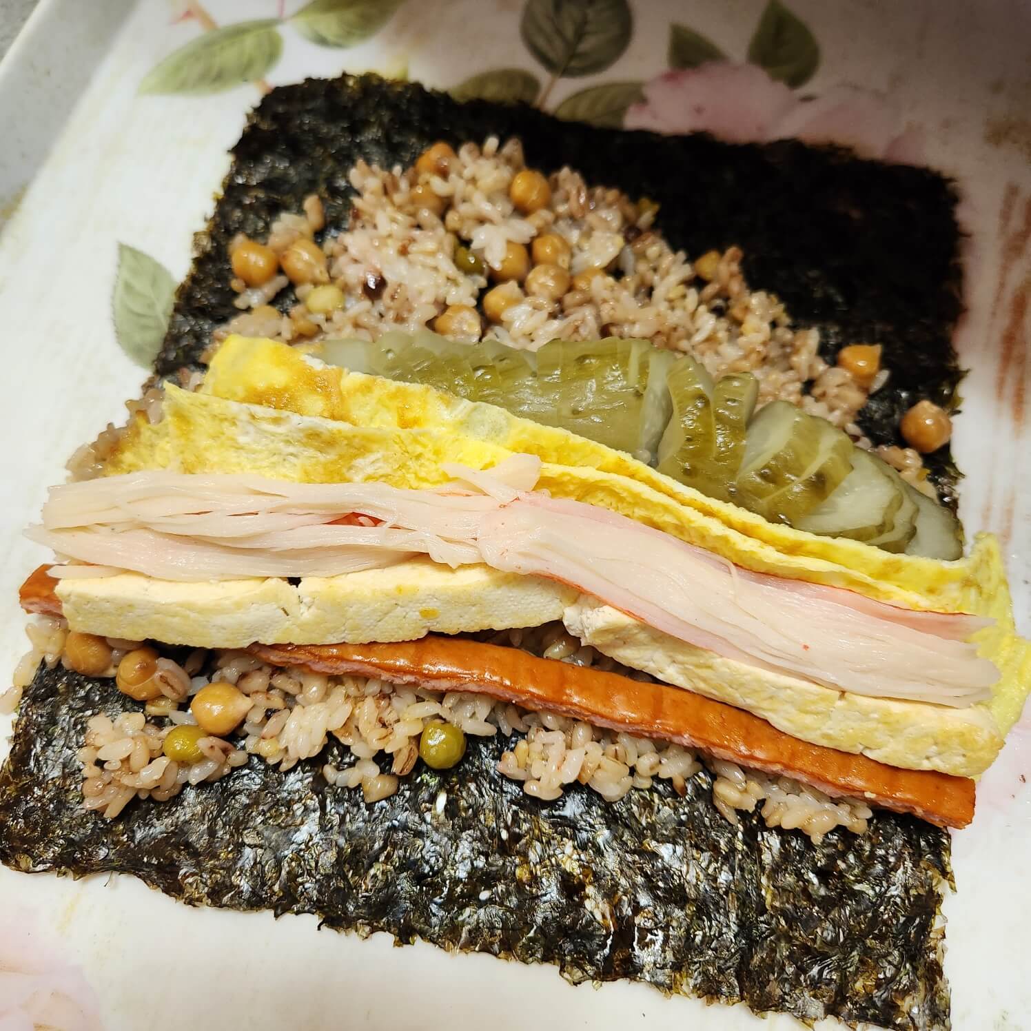 • 배추, 상추, 햄, 맛살, 잡곡밥 도는 현미밥, 계란, 두부, 김, 단무지