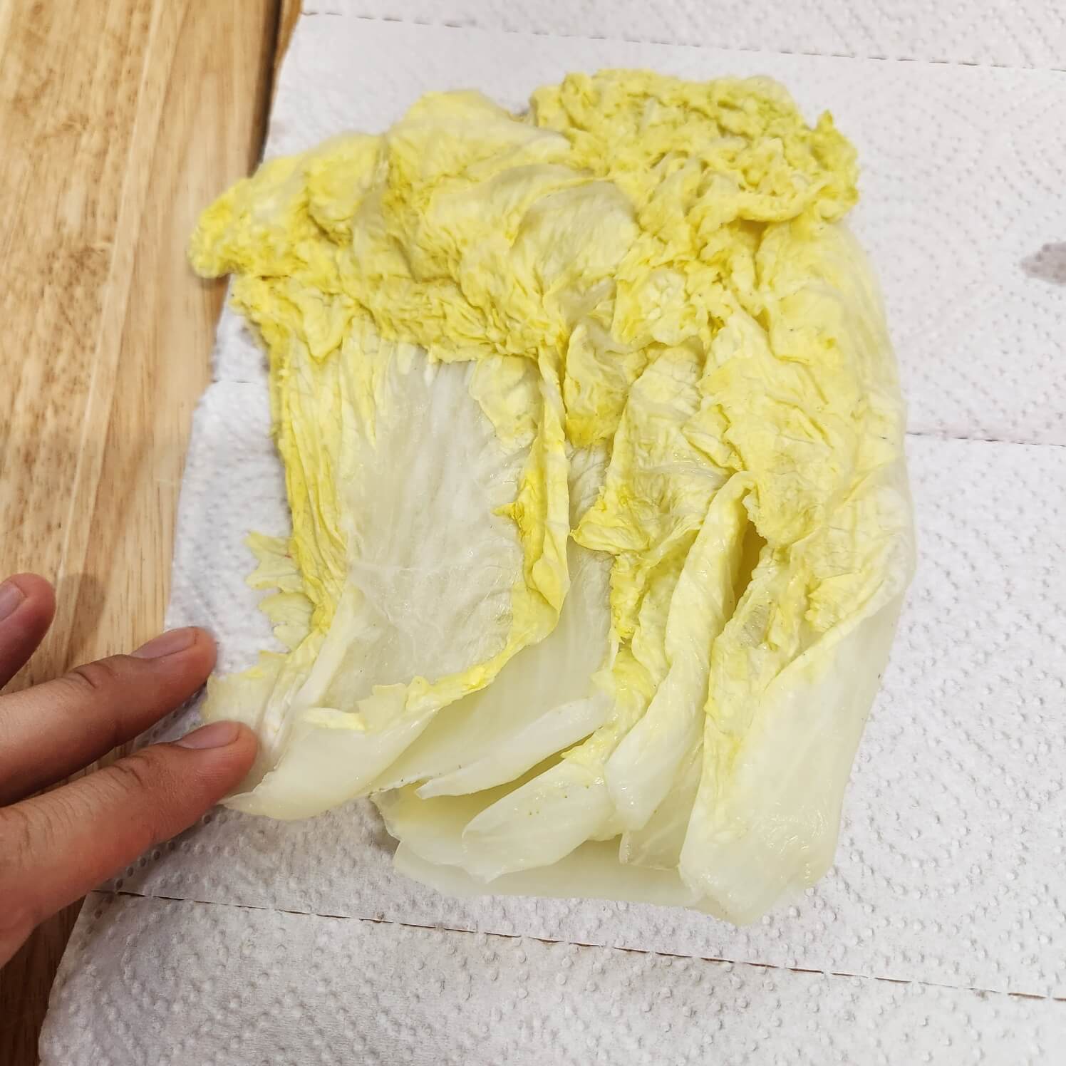 5. 전자레인지에 찐 배추도 식으면 키친타월로 짜주시면 됩니다.