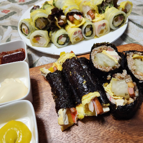 • 배추, 상추, 햄, 맛살, 잡곡밥 도는 현미밥, 계란, 두부, 김, 단무지
