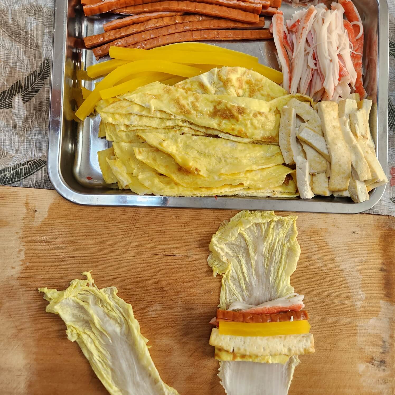 ✔배추 위에 계란, 햄, 맛살, 단무지, 두부를 올려주고 말아 주면 완성입니다.