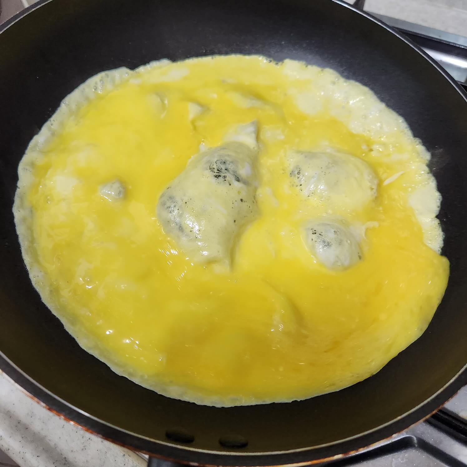 • ✔세 번째 사진처럼 끝 부분이 어느 정도 익었고 계란이 고체형태로 변화된 게 보이면 뒤집어 주시면 됩니다.