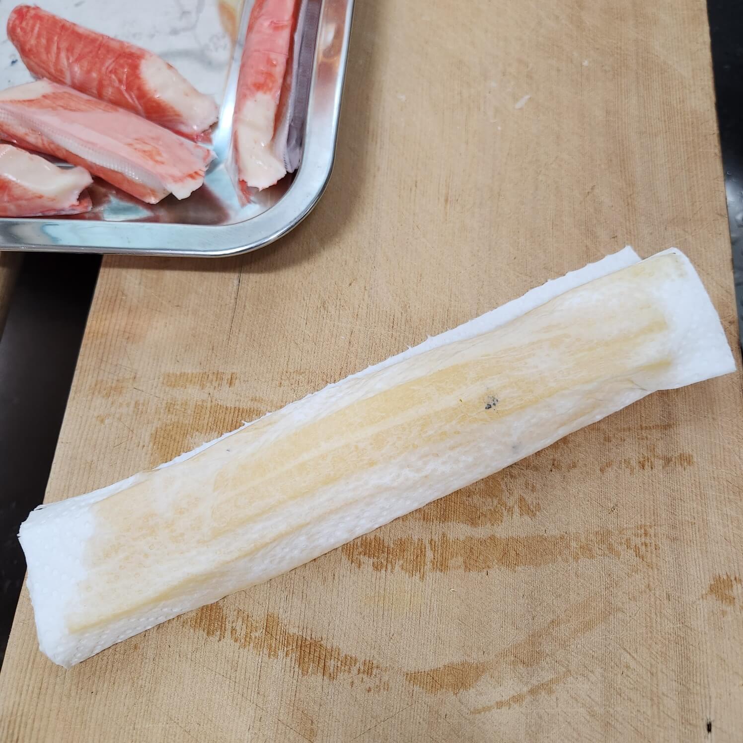 4. 단무지는 키친타월로 짠기를 전부 제거해주면서 꼭 짜주시면 됩니다.