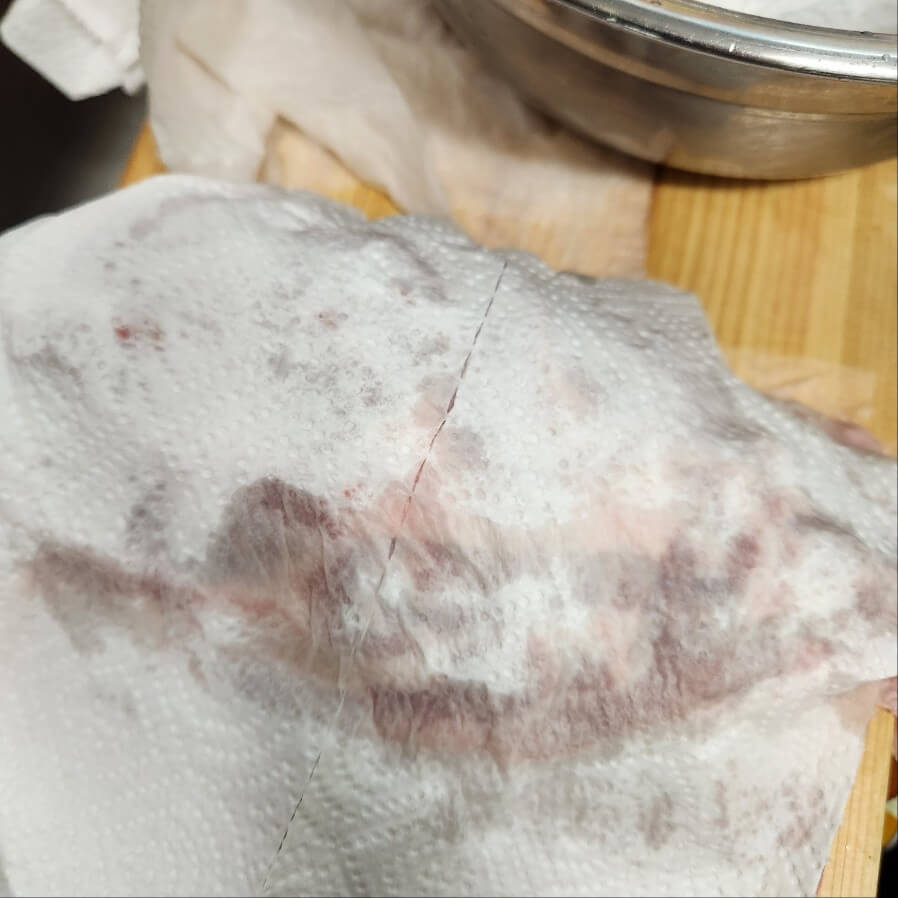 4. 돼지고기는 키친타월로 물기를 제거해 주고 양념장에 넣고 숙성을 해주면 된다.