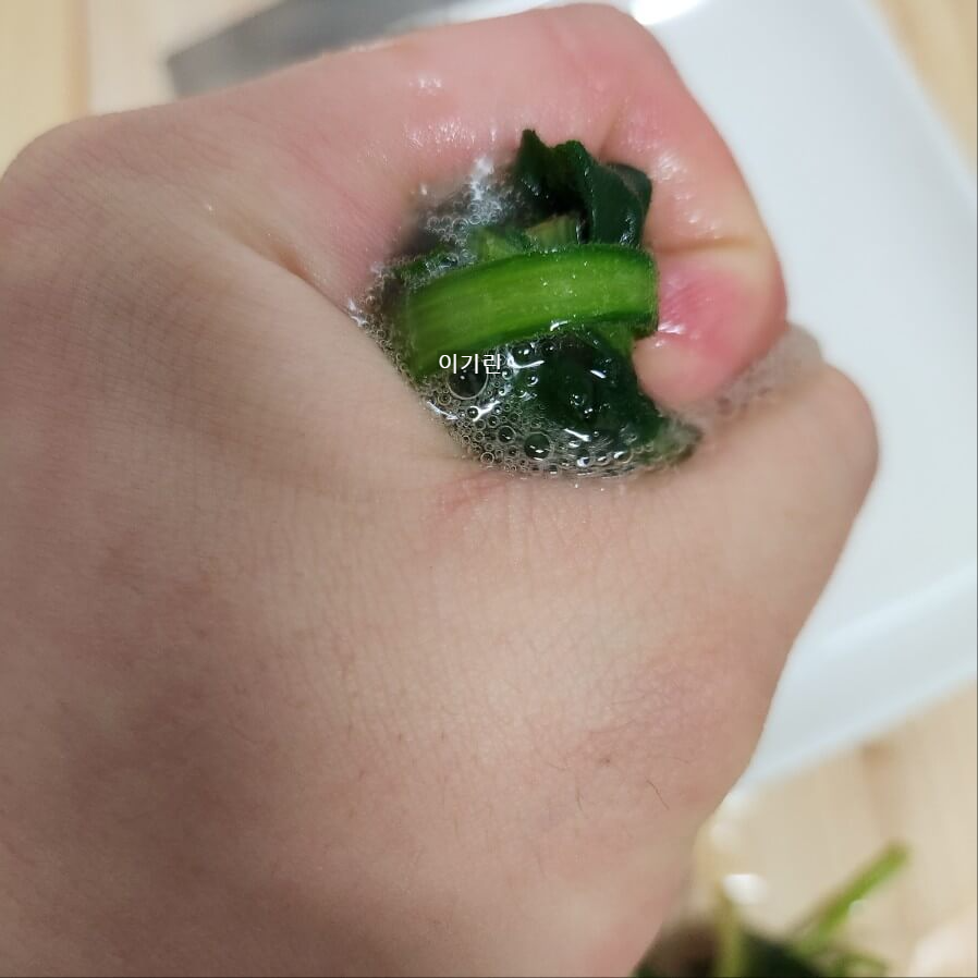 👉앞면 1분, 뒤접어서 1 분 센불로 데치고 물기를 꼭 짜서 준비해 주면 된다.