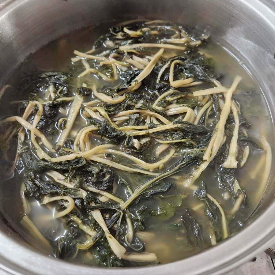 👉가정용 화구에 따라서 시간은 변할 수 있지만 시래기와 투명한 껍질이 분리 되면 그만 끓여도 좋다.
