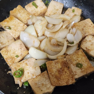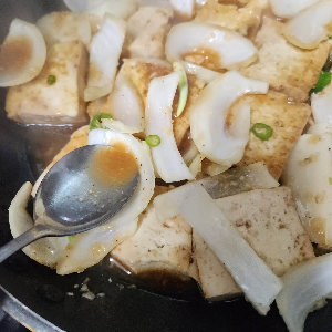 6. 중간에 두부를  중간에 한 번씩 뒤집어 주시면서 간장 소스를 두부, 양파에 뿌려주시면 간이 더욱 잘 배어요.